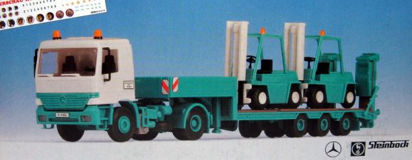 Тягач "MercedessBenz" и 2 погрузчика на прицепе-платформе. Сборная модель, масштаб 1/87, цветной пластик.